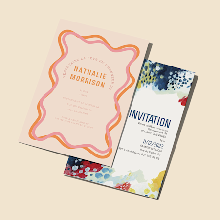 Par ailleurs, nous pouvons vous aider à créer une invitation unique et parfaitement adaptée à votre évènement : la solution idéale pour obtenir les cartes dont vous avez besoin, même si vous n’avez pas trouvé votre bonheur parmi nos modèles existants.