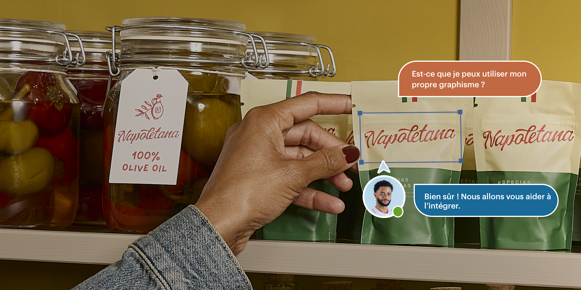 Les entreprises, comme leurs produits, sont de formes et de tailles différentes. Avec un packaging flexible, vous avez tous les outils en main pour que l’image, le toucher et le goût de vos produits répondent aux attentes des clients. Faites votre choix parmi nos modèles professionnels ou créez votre propre graphisme à partir de zéro. Quoi que vous choisissiez, VistaPrint est à vos côtés pour vous faciliter la tâche. Si vous rencontrez un problème, vous trouverez toujours une option pour demander de l’aide.