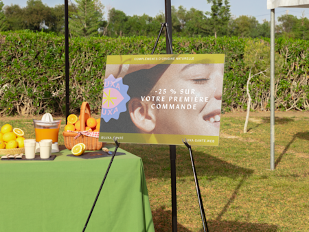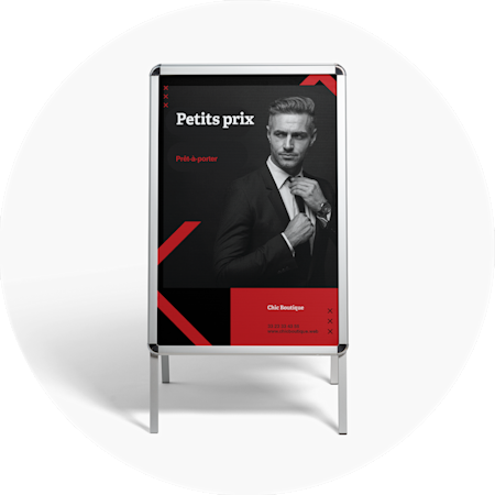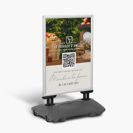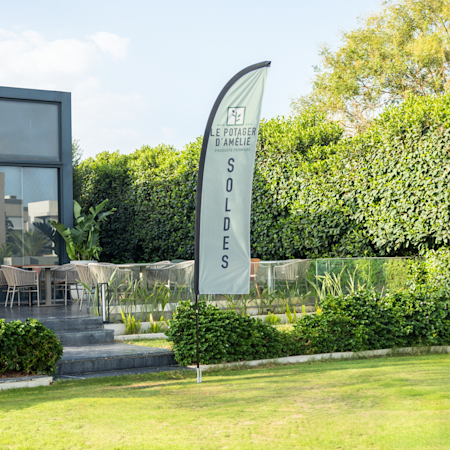 Nous proposons une vaste gamme de produits d’affichage extérieur à destination des professionnels et des particuliers. Attirez les piétons et communiquez vos offres, vos horaires, etc. à l’aide d’un chevalet de trottoir léger, d’un drapeau publicitaire sur pied, d’un chevalet ardoise modulable ou d’un panneau publicitaire anti-décoloration. Assurez-vous que tout le monde puisse voir votre message, même parmi la foule, avec nos drapeaux personnalisés en polyester anti-intempéries, faciles à ranger et à transporter. Quant aux bâches microperforées, elles sont colorées et laissent passer le vent.