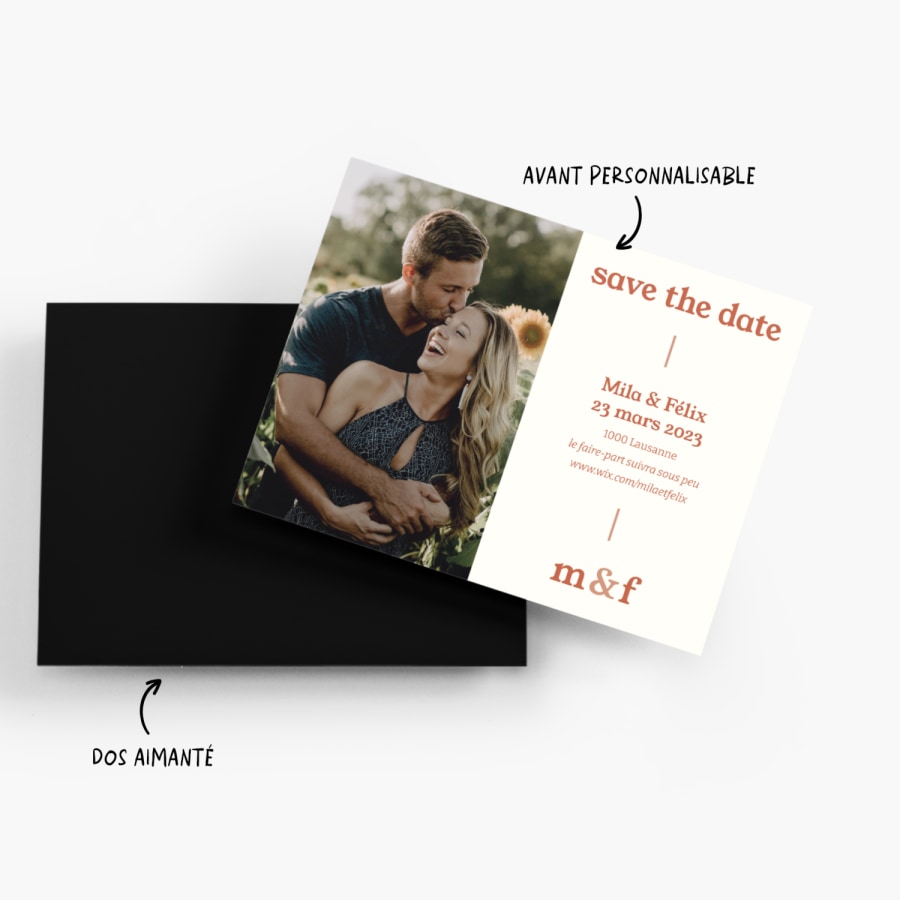 Imprimés sur une feuille magnétique résistante, les Save the date de mariage magnet se fixent sans difficultés et sont assez légers pour être envoyés par courrier sans frais supplémentaires. Plus originaux que les traditionnelles cartes d’invitation, ils permettent de surprendre les invités dès l’ouverture de l’enveloppe. Une fois que l’événement est passé, les Save the date aimantés se transforment souvent en souvenirs et restent exposés longtemps après le premier anniversaire de mariage.