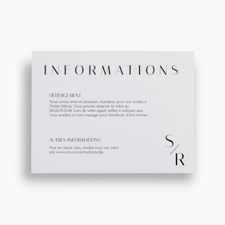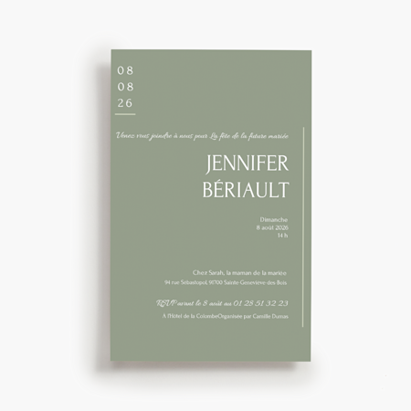 Il vous suffit de taper vos informations, et le tour est joué ! Pour certains événements, nous avons pris soin d’inclure davantage d’espace pour accueillir des informations supplémentaires. Par exemple, les invitations à une baby shower ou une fête prénuptiale comportent une section pour la liste (de mariage ou de naissance).