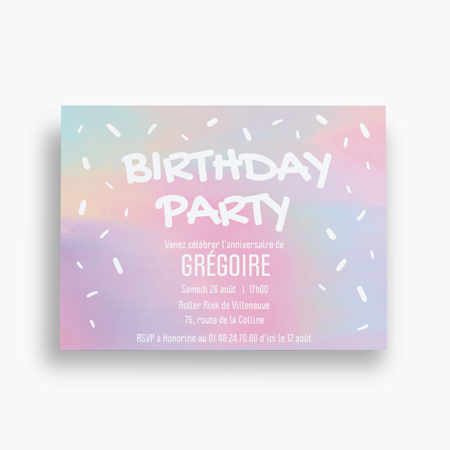 Plusieurs moyens simples vous permettent d’embellir vos invitations. Pour commencer, choisissez un modèle assorti au thème de la fête. Ensuite, laissez aller votre créativité : lorsque vous personnalisez vos invitations, essayez différentes palettes de couleur, un effet métallisé ou des coins arrondis.