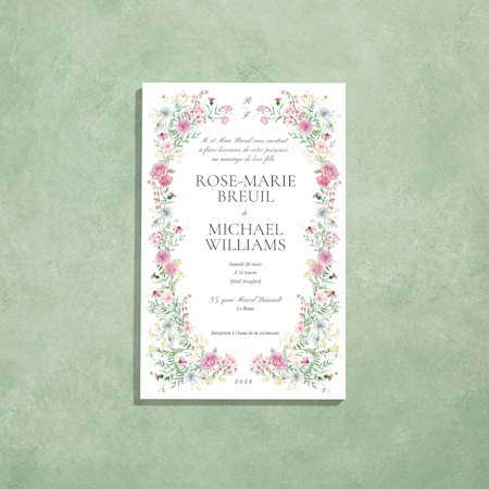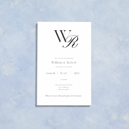 Un assortiment de mariage classique comprend une carte « save the date », un faire-part de mariage et une carte de réponse ou un carton d’accompagnement. Si vous souhaitez donner à vos invités la possibilité de confirmer leur présence de façon numérique, ajoutez un code QR sur votre invitation pour les renvoyer directement au site Internet de votre mariage.