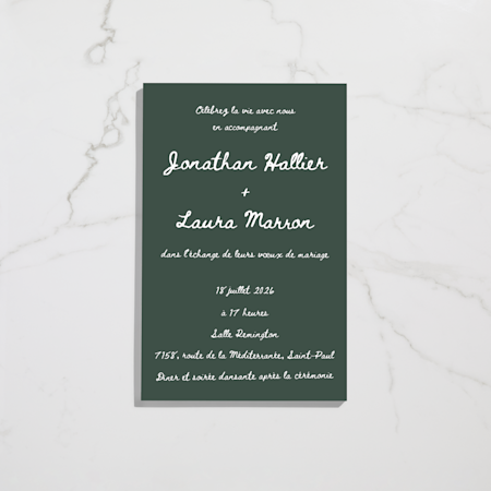 Votre grand jour approche à grands pas… C’est le moment d’inviter officiellement vos proches à célébrer cette heureuse occasion ! Mariage intime, célébration grandiose ou encore cérémonie à l’étranger : quelles que soient vos envies, vous trouverez chez VistaPrint des assortiments de papeterie de mariage en harmonie avec votre vision. Après plus de 20 ans d’expertise en impression d’articles de papeterie, nous sommes convaincus que vous apprécierez nos matériaux de haute qualité, nos superbes modèles et notre service client à l’écoute – sans oublier nos tarifs doux pour votre portefeuille.