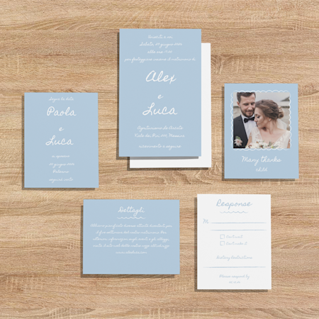 Il set di articoli di cancelleria per matrimoni più classico è composto da biglietti Save the date e partecipazioni, accompagnate da biglietti di risposta o bigliettini da allegare. Se vuoi dare agli invitati la possibilità di rispondere all’invito online, includi un codice QR con un link al sito web del tuo matrimonio all’interno degli inviti.