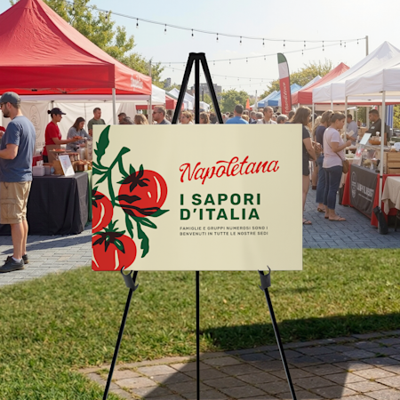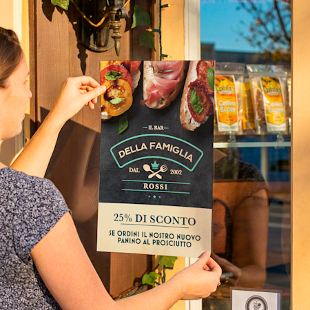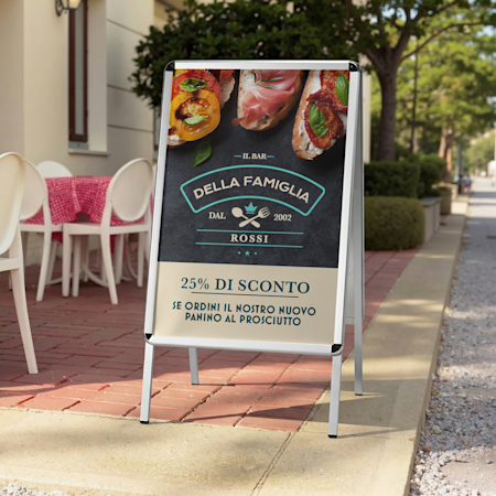 Realizzati in materiali che resistono a vento e agenti atmosferici, i nostri cartelli per esterni offrono tutta la robustezza e la luminosità di cui hai bisogno per richiamare l’attenzione su food truck, bancarelle, tavoli all’aperto, mercatini, parcheggi e non solo. Ti basterà scegliere il prodotto promozionale che desideri per il tuo spazio all’aperto e caricare il tuo design o sceglierne uno della nostra ampia galleria. I nostri team di designer esperti e di addetti all’assistenza clienti sono disponibili per supportarti in ogni fase, se necessario. Il tuo bellissimo prodotto ti verrà consegnato in men che non si dica e, all’arrivo, sarà già pronto a essere utilizzato per spargere la voce.